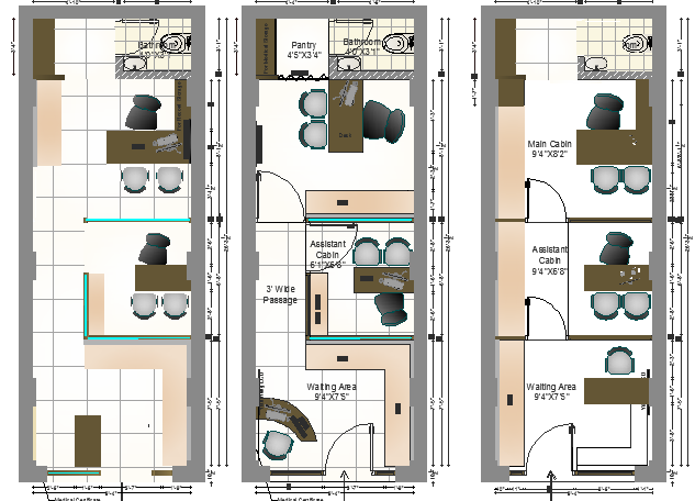 Floor plan layout details of clinic that includes a detailed view of ground floor, first floor, second floor with main entry door, reception area, waiting area, indoor staircases, doctors cabin, toilet and much more of floor plan details of clinic.