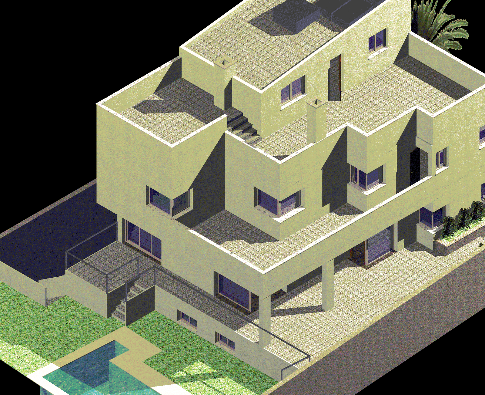 3D Villa DWG of Three Storey Design with Pool and Terrace Layout