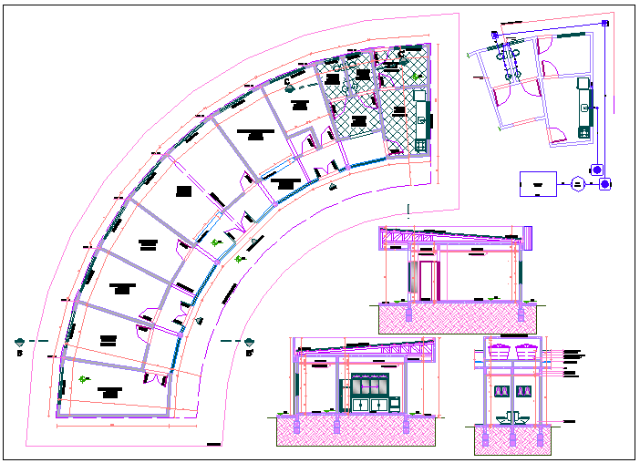 Elevation and Circular design layout plan of building, this file contains layout plan of a offce and elevation design