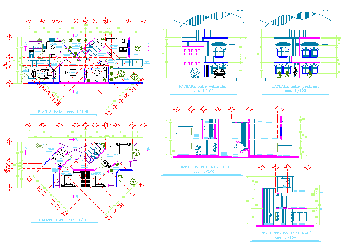Complete House dwg file. Layout plan of ground floor plan and first floor plan with furniture detail, section plan and elevation design of Complete House plan.