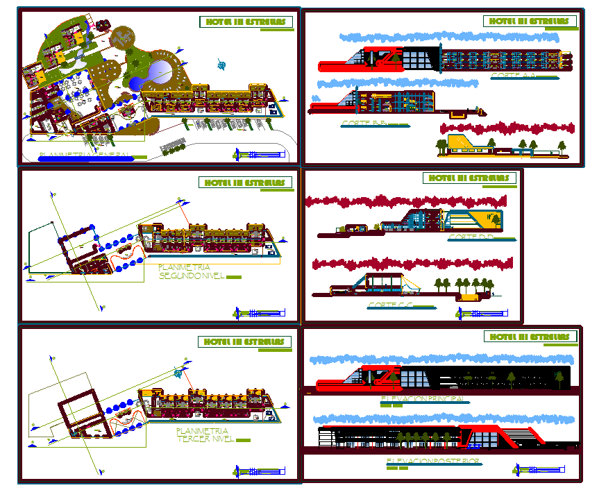 3 Star Hotel dwg file. The architecture layout plan of ground floor plan, first floor plan, second floor plan with furniture detail, swimming pool, structure plan, landscaping design, vehicle parking area, section plan and elevation design of 3 Star Hotel project.