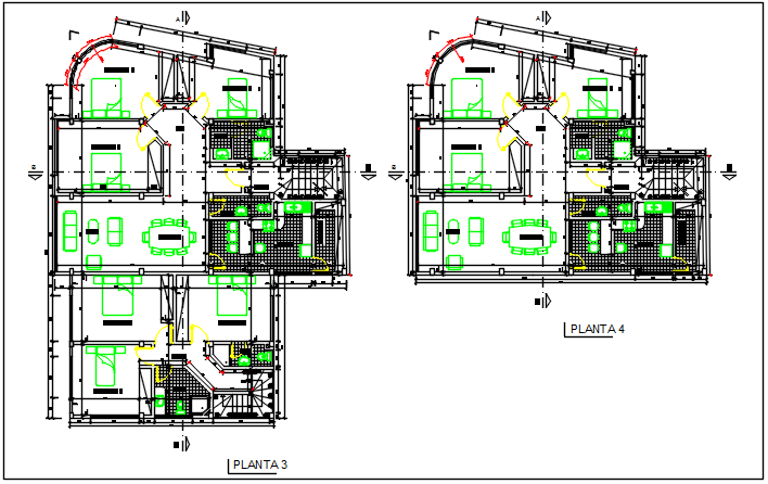 Second floor and third floor plan detail dwg file, Second floor and third floor plan detail with furniture detail, sofa, table, chair, bed, plant, elevation and section line detail, etc.