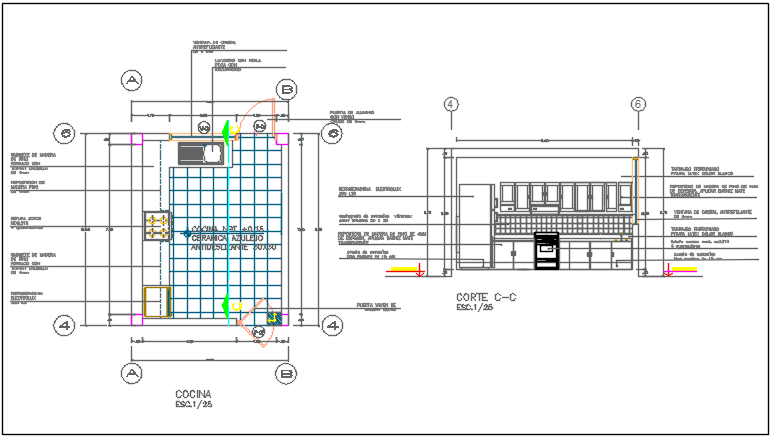Kitchen plan and elevation plan detail dwg file, Kitchen elevation detail with dimension detail, naming detail, door, window, stove, center line plan, door, window, etc.