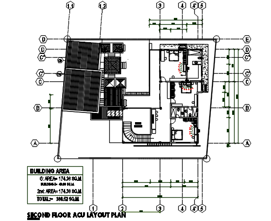 Second floor plan in A.C. detail dwg detail Second floor plan in A.C. with dimension detail, naming detail, furniture detail, chair table, A.C section and elevation detail, center line plan detail, etc.