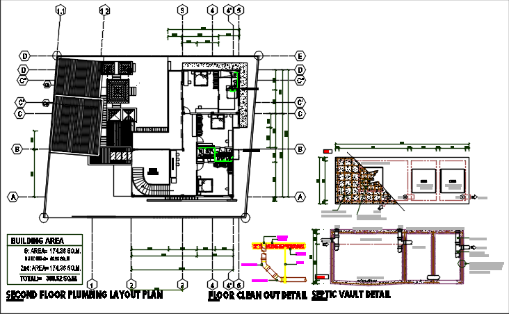 Second floor plumbing plan detail dwg detail, Second floor plumbing plan with dimension detail, naming detail, furniture detail, chair table, cash basin section detail, center line plan detail, etc.