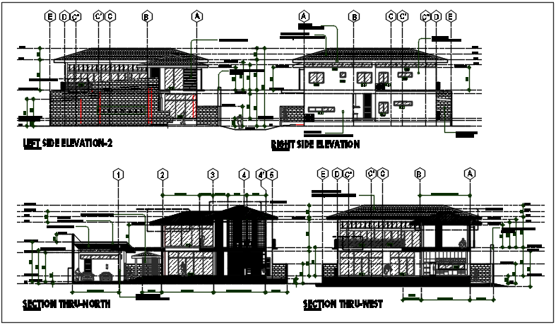 Elevation plan detail dwg file, Elevation plan detail with front elevation and rear elevation in dimension detail and naming detail, front elevation and side elevation detail, left elevation and right elevation, window detail in the elevation 3” up detail, reeling detail, etc.