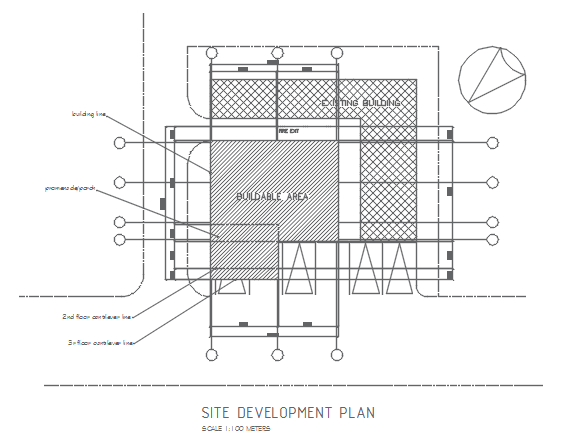 Site development detail dwg file, Site development detail with center line plan, dimension detail, naming detail, north direction detail, scale drawing 1:100 METRES, ETC.