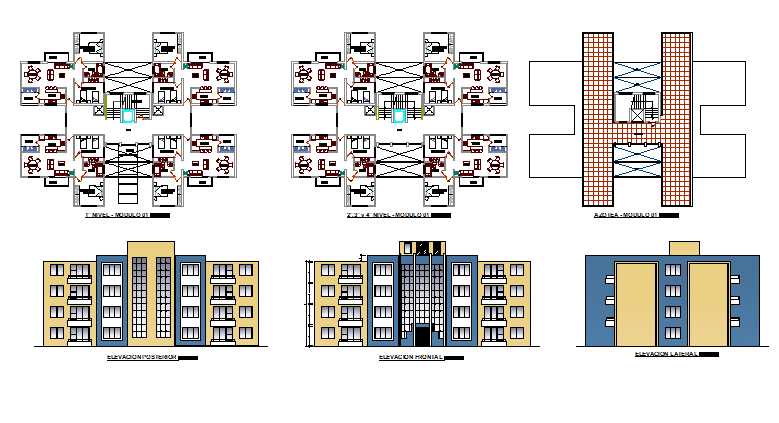 All sided elevation and floor plan details of residential apartment building dwg file.