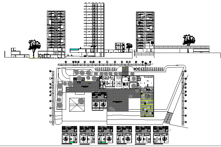 Multi-flooring five star hotel architecture full project details that includes a detailed view of landscaping details, site plan, front elevation, back elevation, sectional view, structural layout plan details, doors and windows view, staircase view, tree view, flooring view, reception area, waiting and sitting lounge, suits, rest rooms and much more of hotel project details.