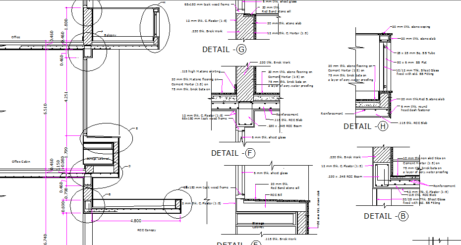 Balcony and canopy construction details of house that includes a detailed view of storage cabinet, brick work, slab stone, stone flooring on cement, reinforcement of slab, sheet glass, plaster, beam, rcc slab and much more of balcony construction details.