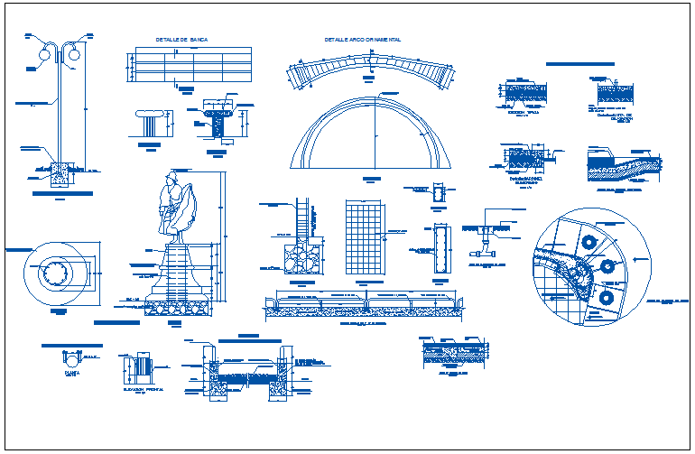 Decorative indoor equipment of public garden that includes a detailed view of decorative statue, decorative light pole, decorative dome view, bench view, wooden bench and much more of garden equipment details.