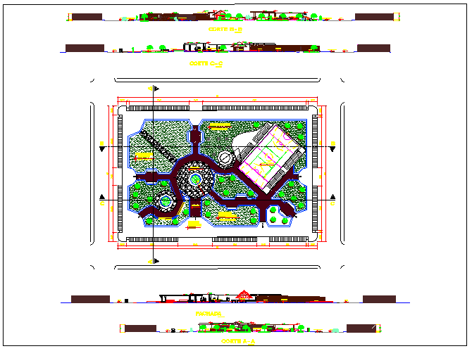 All sided elevation and landscaping details of public garden that includes a detailed view of front elevation, back elevation, main entry gate, outdoor wooden benches and shops, landscaping, car parking view, green area, kids play area, decorative garden equipment, decorative tree and plants and much more of garden details.