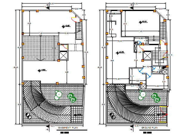 Basement plan and groung floor plan, Working plan detail dwg file, Working plan detail in dimension detail and naming detail, plumbing sanitary detail in basin elevation detail, garden area detail, etc.