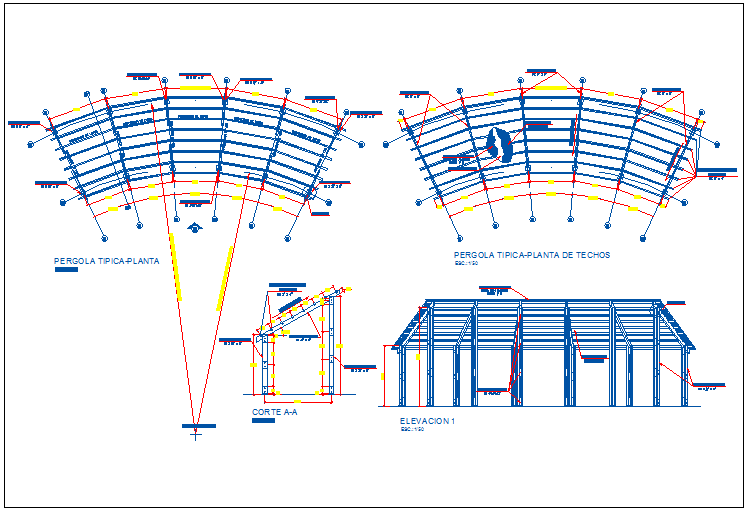 Wooden pergola and grass roof details of private garden that includes a detailed view of elevation view of roof, sectional view, cuts, measurements, grass roof view, roof net details and much more of pergola and roof details.