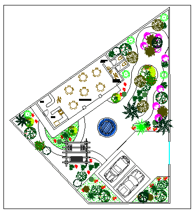 Landscaping details of private house garden that includes a detailed view of main entry gate with fence, car parking area, garden equipment, tree view, green area, garden cafeteria, general toilets, water fall fountain, garden decorative equipment and much more of garden landscaping details.