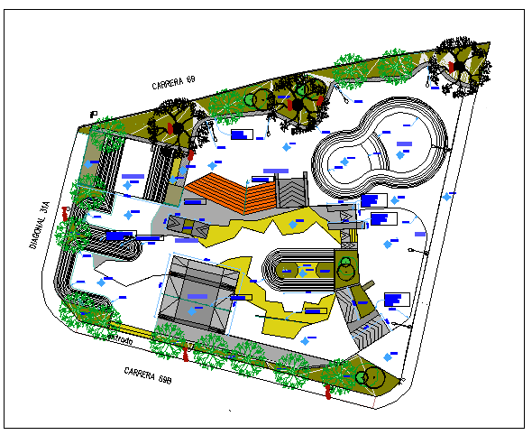 Theme and adventure city park landscaping details that includes a detailed view of main entry gate elevation and section details, tree view, swimming pool, kiosk, green area, decorative garden equipment like gazebo, pergola, benches, kids playing equipment, tree and plant decorative equipment, fountain and much more of theme park landscaping details.