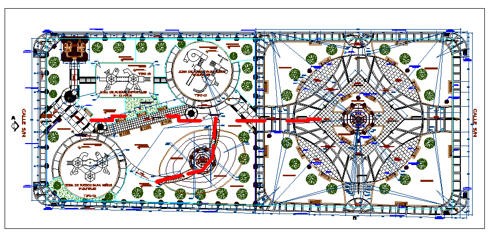 Detailed landscaping view of public theme garden that includes a detailed view of main entry gate elevation and section details, tree view, green area, decorative garden equipment like gazebo, pergola, benches, kids playing equipment, tree and plant decorative equipment, fountain and much more of garden landscaping details.