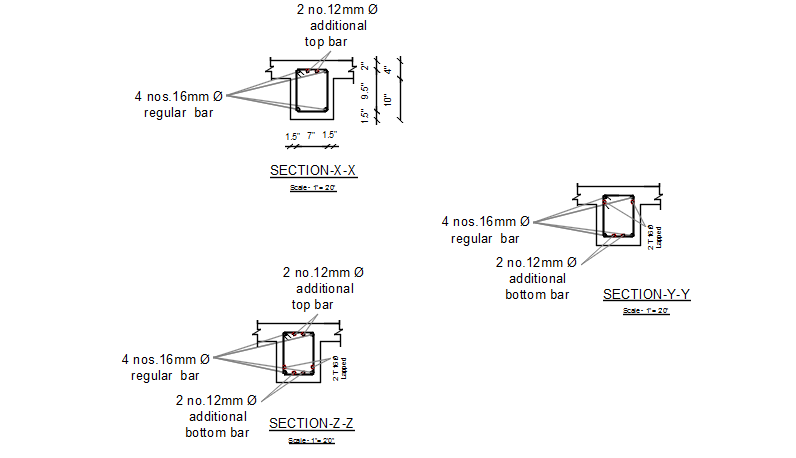 Column section plan detail dwg file, Column section plan detail with reinforcement detail plan, dimension detail, naming detail plan detail, section X-X’, section Y-Y’, section Z-Z’, 2 no. 12mm dia, 4no.16mm dia, used reinforcement, etc.