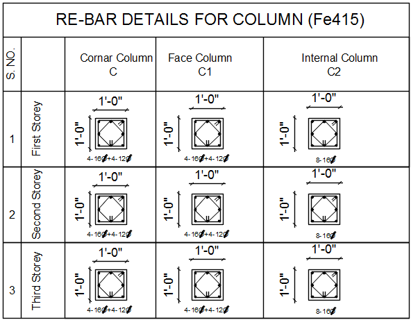 Re-bars details of for column table dwg file, Re-bars details of for column table with fist story, second story and third story, cornar column, face column and internal column detail, reinforcement detail, dimension detail, naming detail, etc.