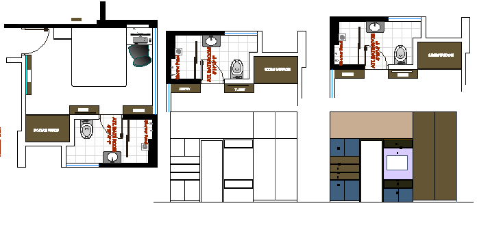 Sanitary installation details of one family housing that includes a detailed view of bathroom elevation, bathroom sectional details, door view, passage, toilet sheet installation, sink view, ventilation and much more of sanitary installation details.