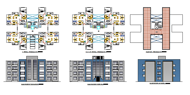 Multi-family apartment building elevation and floor plan details that includes a detailed view of flooring view, elevation view of all sides, doors and windows view, wall design, balcony view, main entry gate, family hall, kitchen, dining area, living room, bedroom, and much more of housing apartment building project.