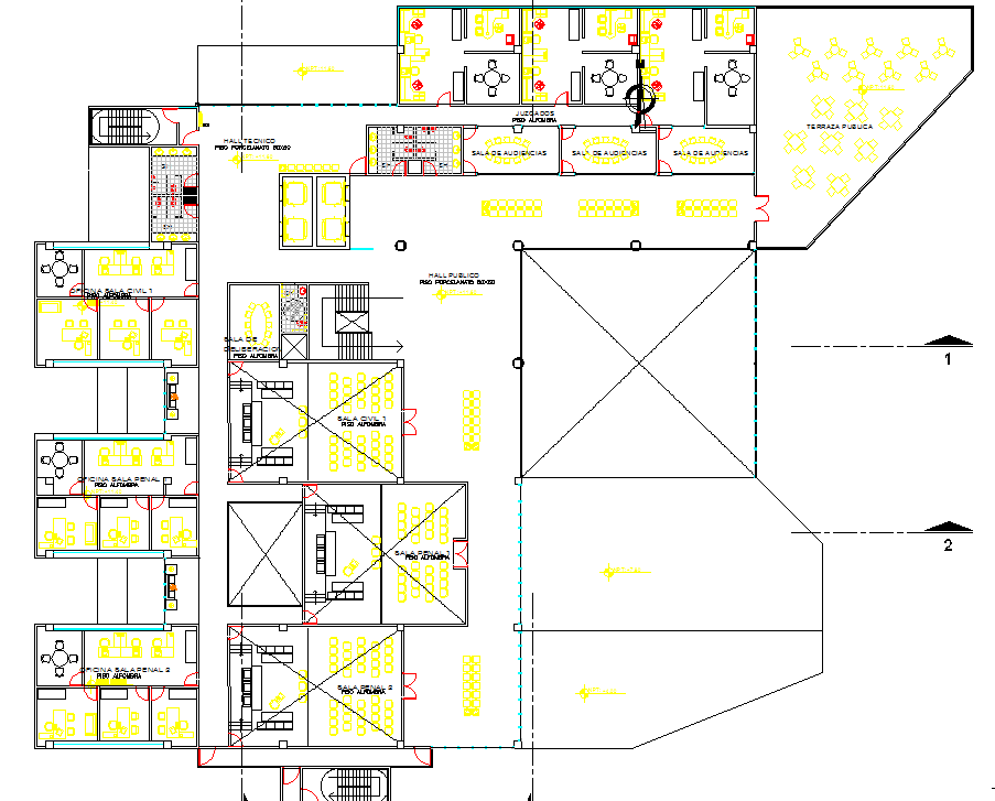 layout plan of a builidng dwg file, here there is a top view layout plan of a office , modern design layout, sitting area,furniture detailing etc
