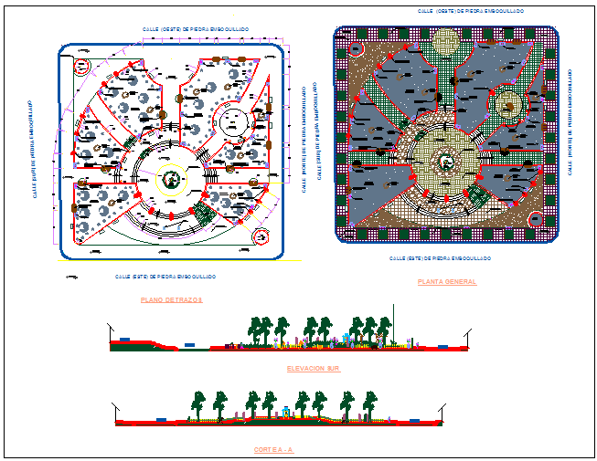 Public garden main gate elevation and landscaping view that includes a detailed view of main gate front elevation, back elevation, pergola, fountain, surrounding perimeter fence, tree view, garden area, landscaping, decorative garden and tree equipment, fountain, gazebo, kiosk and much more of garden design.