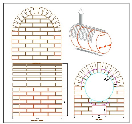 Brick wall of garden architecture project that includes a detailed view of front elevation of wall, back elevation of wall, wall sectional view, measurements details, cuts and much more of brick wall details.