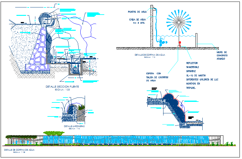 Fountain details of public garden that includes a detailed view of wall construction, landscaping with fountain installation, water diffuse, sub water lamp, perimeter concrete reinforced, transverse cut, solid concrete, polished in integrated color and much more of fountain details.