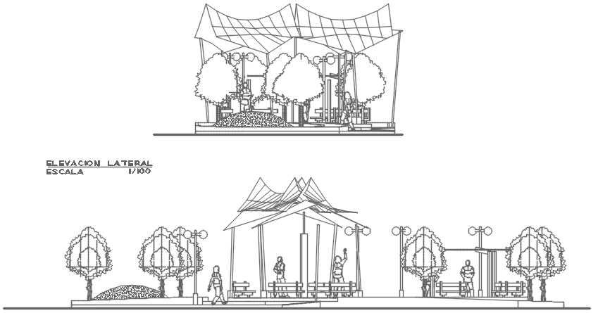 Garden area sitting elevation detail dwg file, Garden area sitting elevation detail with dimension detail, naming detail, both side tree, etc.
