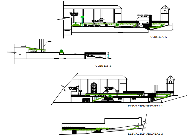 Section and elevation detail dwg file, Section and elevation detail with naming detail, dimension detail, front elevation 1 and front elevation 2 detail, section A-A’ and section B-B’ detail, garden area detail, etc.