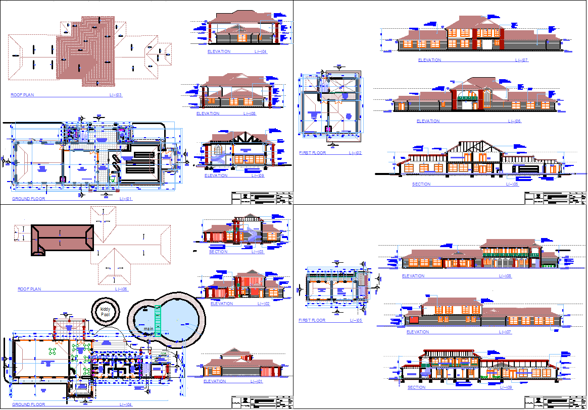 This AutoCAD-DWG file showcases a complete clubhouse design, featuring detailed 2D presentation plans, working drawings, elevations, and sectional views. The architectural layout includes a roof plan, ground and first-floor plans, and all essential structural and architectural elements. The design incorporates amenities such as a main swimming pool, kiddy pool, lounge, and recreation spaces, providing a full visualization of a modern clubhouse. Each section and elevation is precisely dimensioned and labeled, ensuring clarity and professional presentation for architects and engineers.