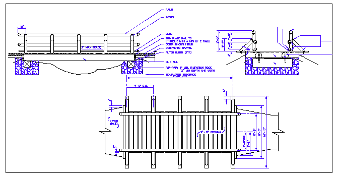 Wooden bridge of garden architecture project that includes a detailed view of wooden bridge floor view, wooden railing view using bamboo, footings details, supportive footing column and beams and much more of bridge details.