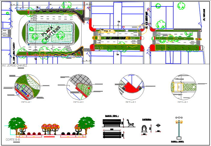 Land sceping garden area detail dwg file, Land sceping garden area detail with different tree elevation detail, section detail in tree, sitting elevation detail, lamp elevation detail, etc.