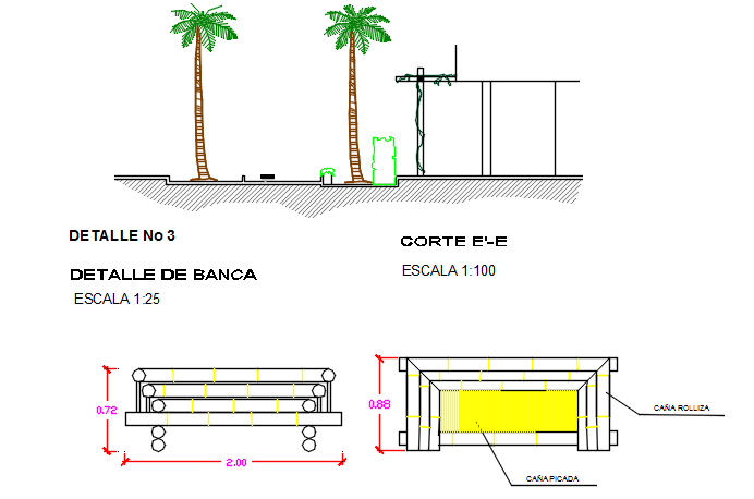 Plan, Elevation and section detail of the land sceping garden area sitting plan detail dwg file, Elevation and section detail of the land sceping garden area sitting detail with naming detail, dimension detail, section E-E’ detail, etc.