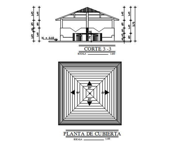 Section and plan detail dwg file, Section and plan detail with dimension detail, naming detail, circle detail, roof elevation, etc.