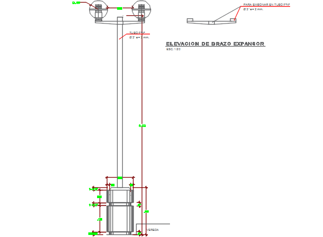 Street light detail dwg file, Street light detail with plan, elevation detail, dimension detail, naming detail, front elevation and lateral elevation detail, etc.
