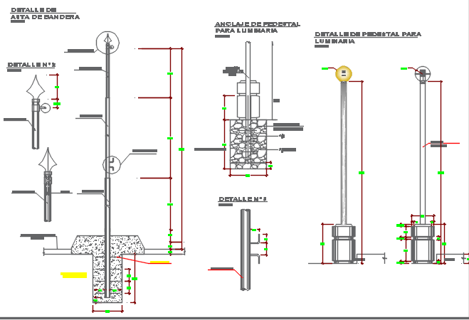 Street light detail dwg file, Street light detail with plan, elevation detail, dimension detail, naming detail, front elevation and lateral elevation detail, etc.