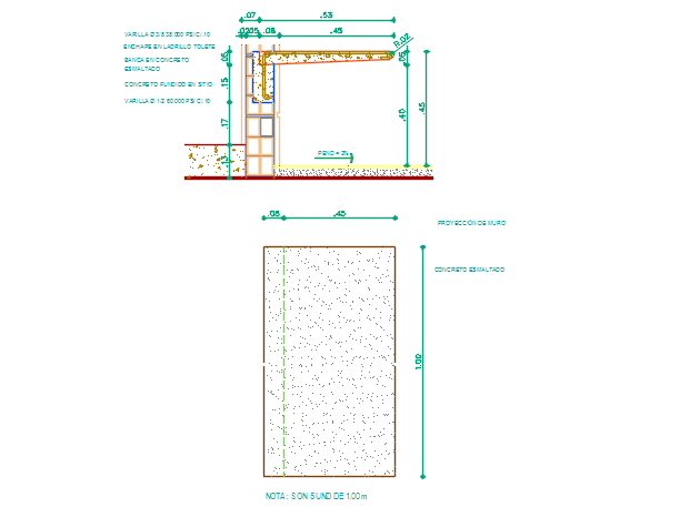 Wall section view detail dwg file, Wall section view detail with specification detail, column and beam concrete detailing, plywood flooring detail, anchoring detail, slab specification detail, dimensions detail, etc.