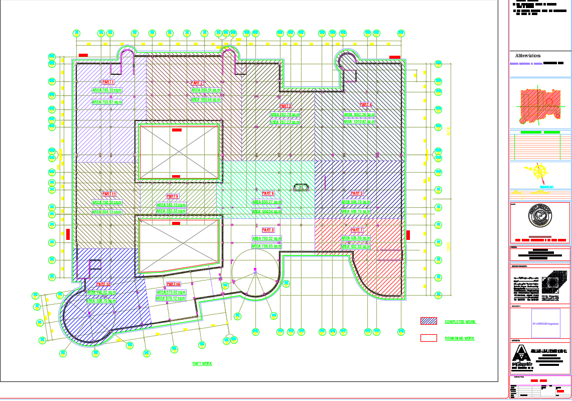 This AutoCAD DWG file presents a complete structural design of a raft footing layout plan, illustrating detailed reinforcement, grid lines, and section divisions. The drawing includes clear demarcation of completed and remaining work, labeled sections (Part 1 to Part 11), and corresponding area measurements in square meters. Each zone is defined with accurate boundary lines and load distribution details, ensuring structural stability and uniform load transfer across the foundation. The plan also indicates grid spacing, column positions, and reinforcement layout suitable for multi-story building projects.