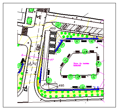 Landscaping with structure of center garden that includes a detailed view of structural layout plan, outdoor road, car parking area, play ground, main entry gate, garden, car parking view, tree view, decorative garden equipment, decorative playground equipment,kiosk, fountain, water area, pergola and much more of landscaping details of garden.