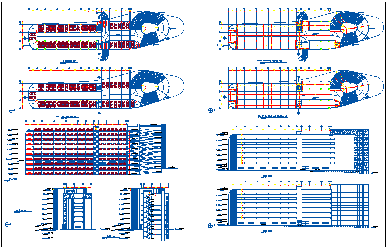 Multi-flooring private parking lot building that includes a detailed view of building elevation view, building sectional view, flooring view, indoor car ramp view, specified car parking space, indoor roads and much more of parking lot details.