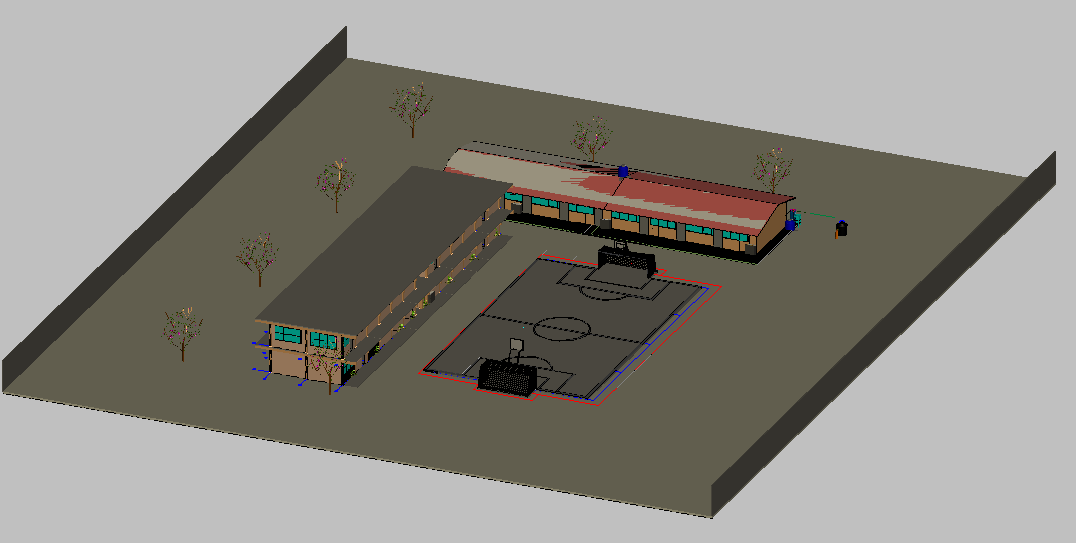 High school 3d elevation dwg file, this file contains 3d elevation of a school, containing play court area,