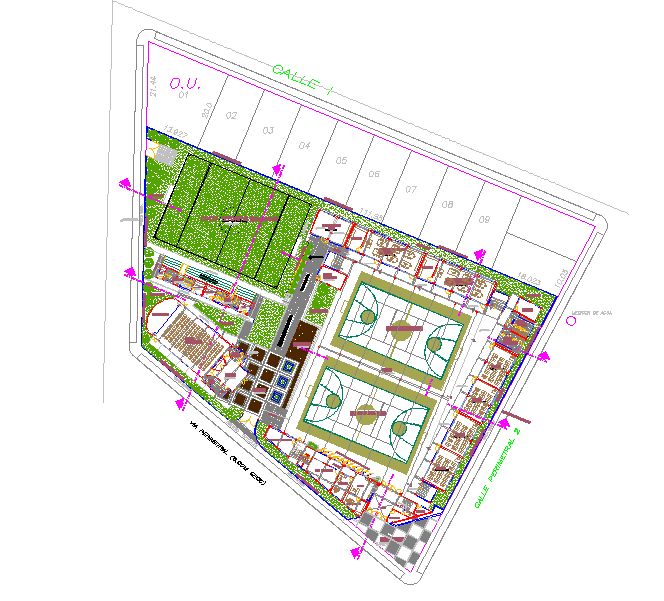 Education institution layout plan dwg file, contains play court area, landscape design in auto cad format