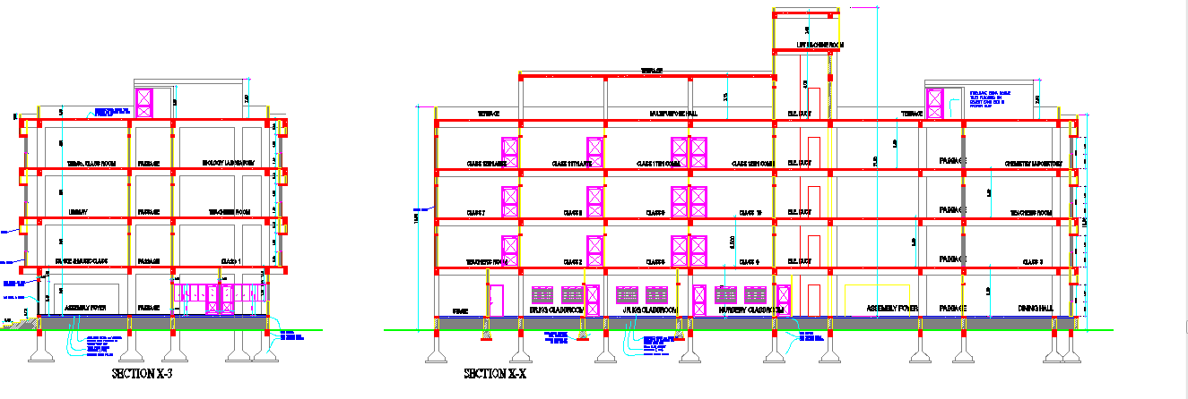 Sectional detail and elevation of a school dwg file