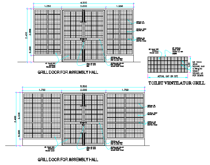 Sectional details of a door dwg file , here there is grill door elevation for assembly hall in school, toilet ventilation also is shown