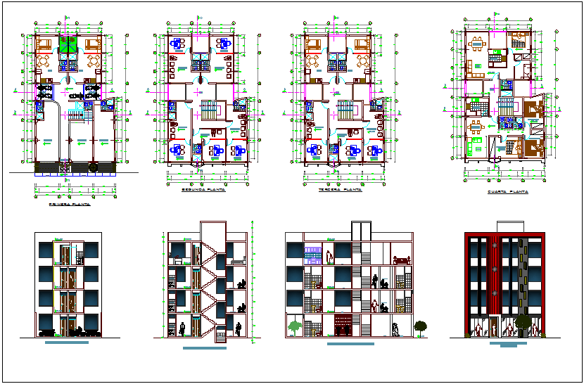 Multi family with offices and stores in jungle zone with floor plan,elevation and section view dwg file
