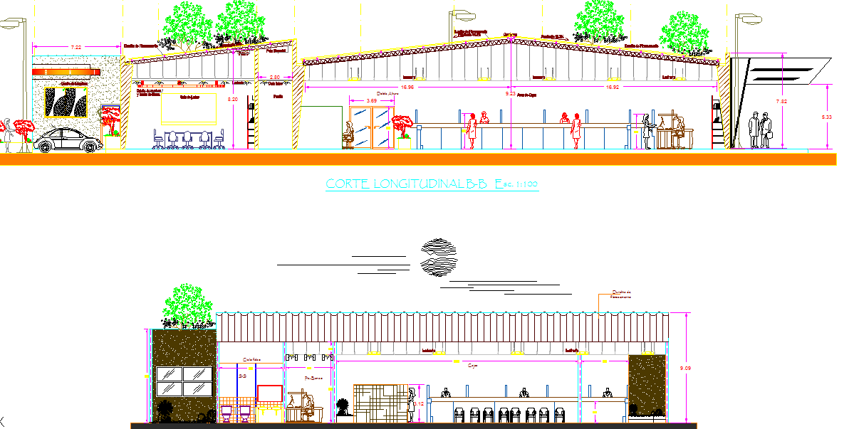 Elevation of bank office minimalist dwg file, elevation of a bank detail, sectional detail, human figure detailing, furniture detailing