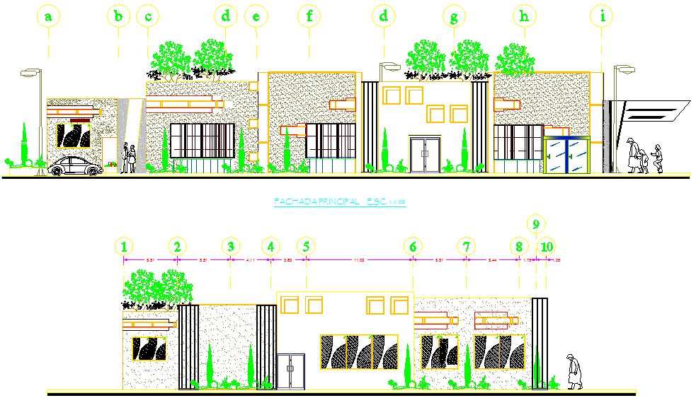 Elevation of bank office minimalist dwg file, elevation of a bank detail, sectional detail, human figure detailing, furniture detailing