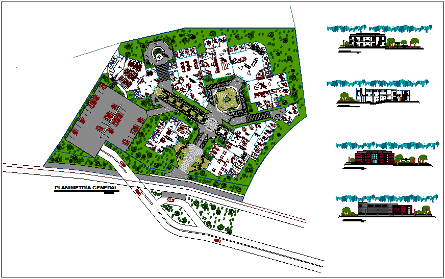 Landscape view,elevation and section view of finance office building dwg file in landscape view with road,tree and floor view,parking area,entry way,hall,reception,